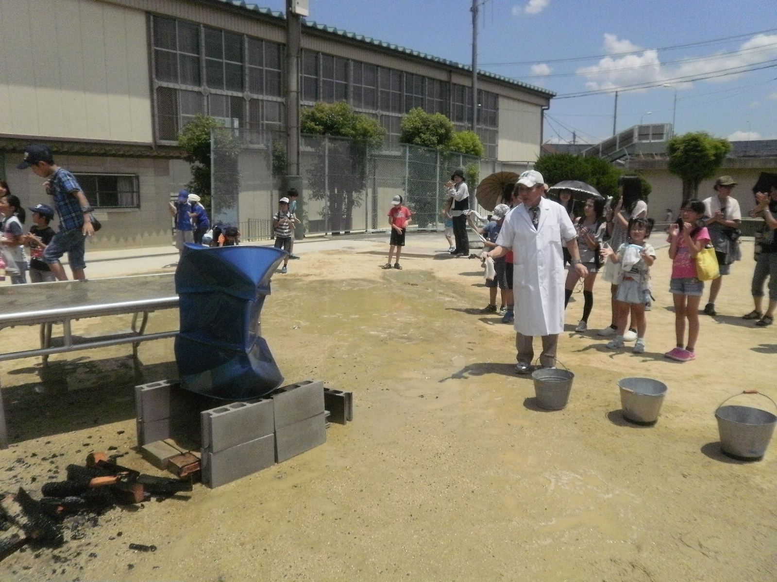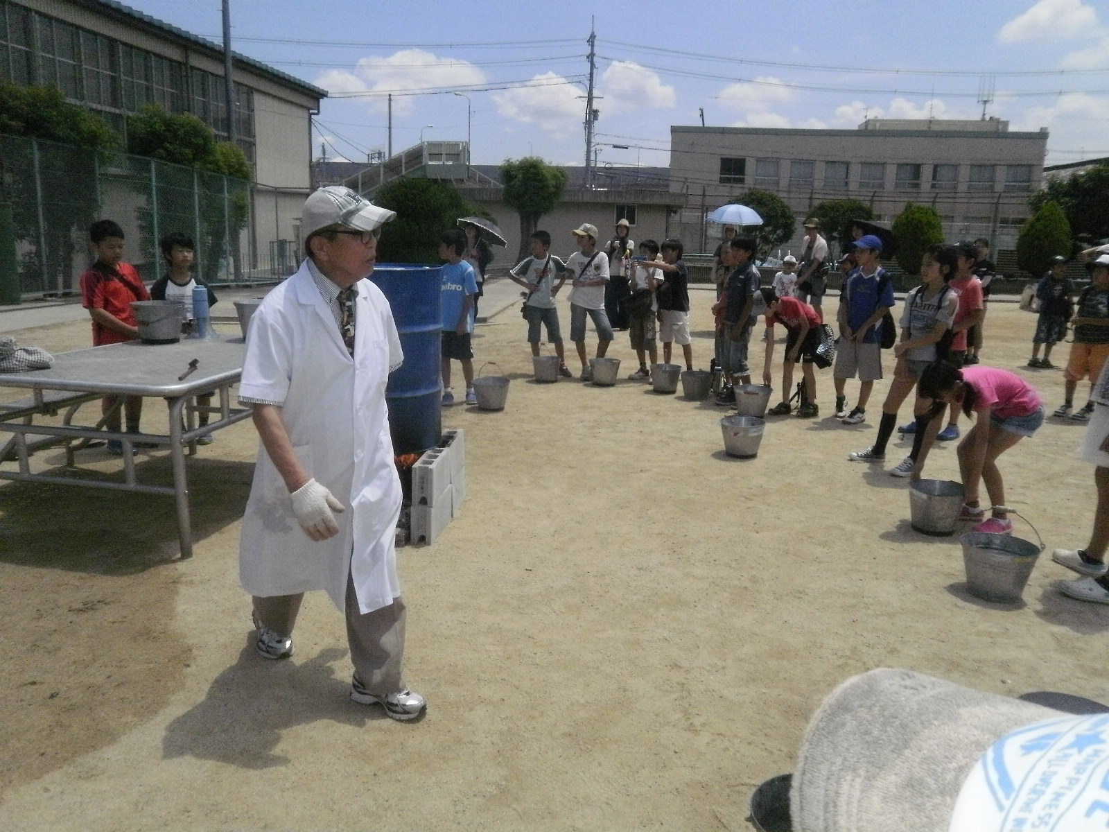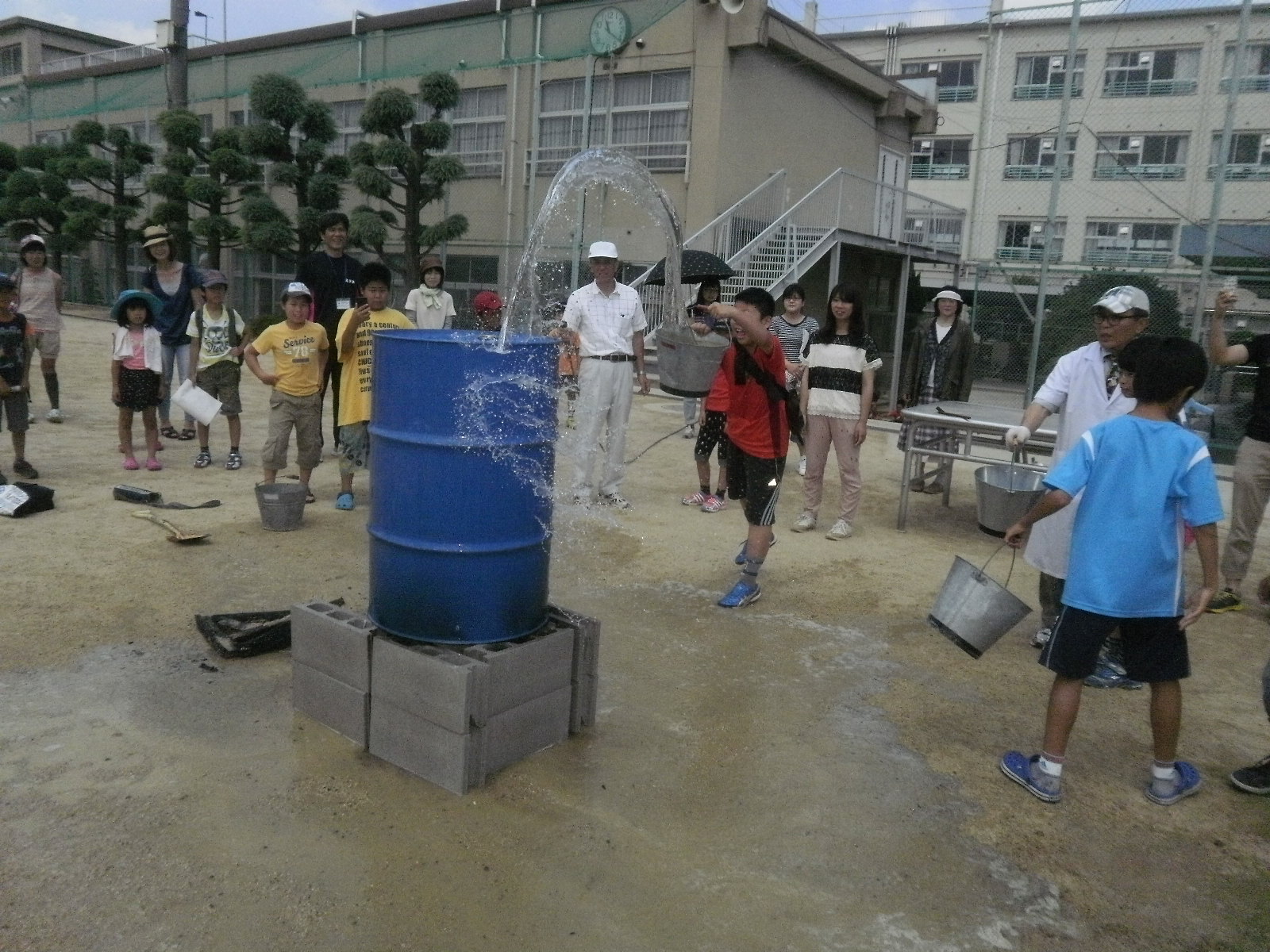 ばけつで水をドラム缶にかけてドラム缶を冷却しています。